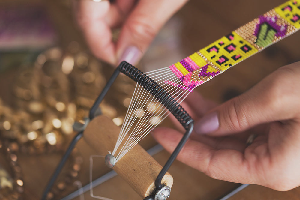 The necklace is woven by Sadie using traditional bead loom techniques, high quality seed beads and a Shh by Sadie pattern. Finished with 24 carat gold plated clamps, gold chain and signature Shh by Sadie tag.