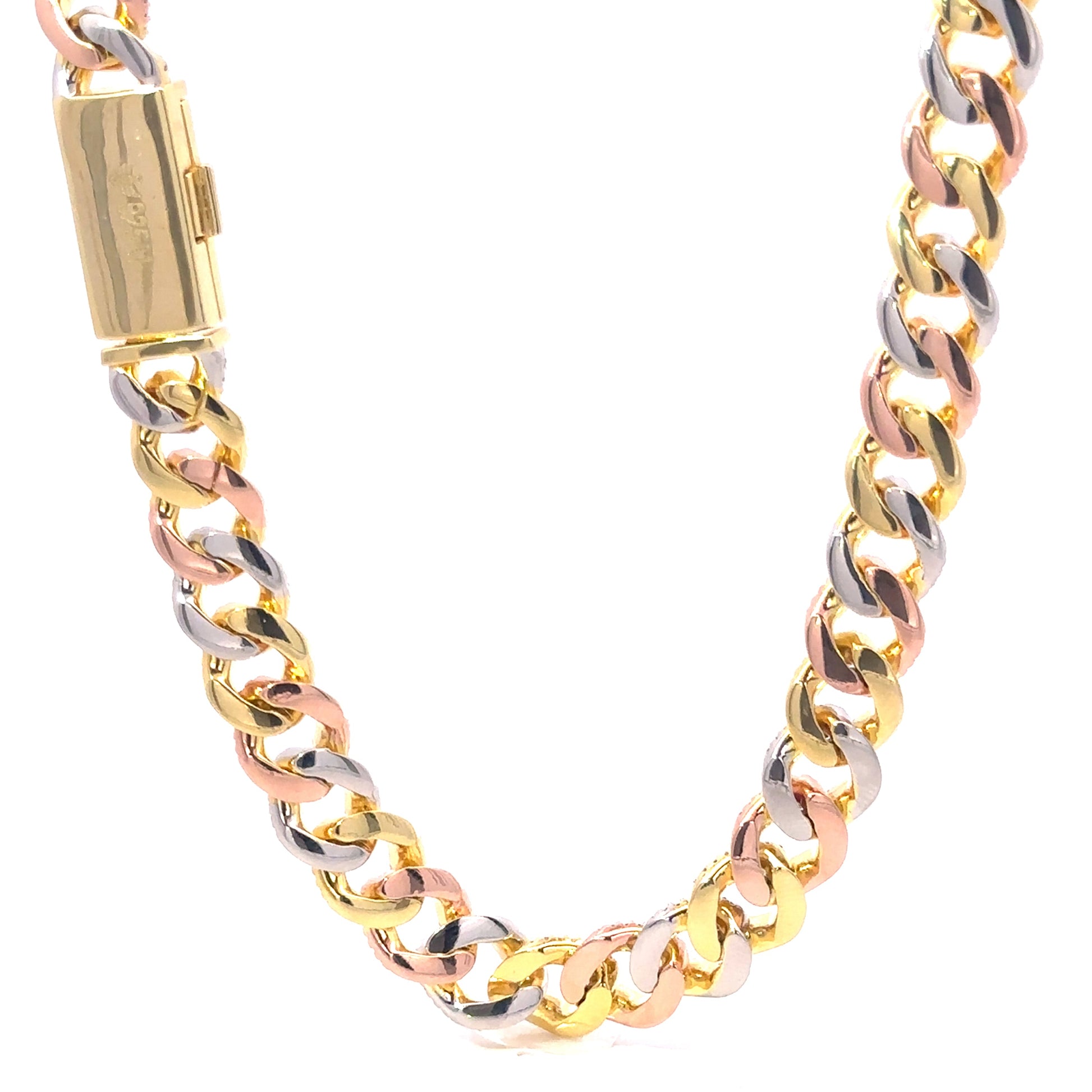 RILANE; This premium quality tri color cuban chain is trendy and long lasting. Adorned with white moissanite stones beautifully, this piece is sure to make a statement. Get your hands on it before it runs out of your access.